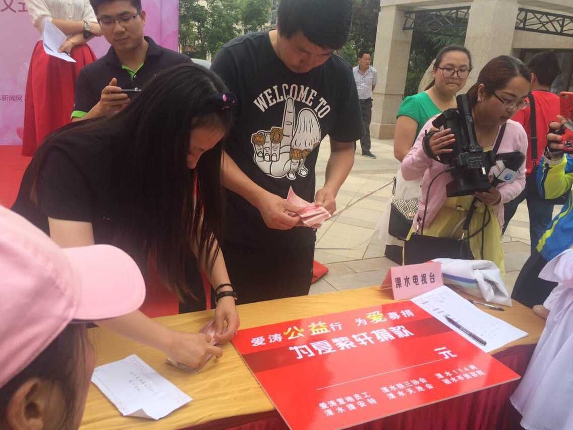 2015年6月7日,高考第一天,這是對(duì)莘莘學(xué)子三年來努力付出具有重要意義的一天;同一天,除了牽動(dòng)人心的高考,一場(chǎng)愛心捐款活動(dòng)也在溧水溫情上演。新實(shí)小學(xué)六(3)班夏紫軒同學(xué)因白血病住進(jìn)了醫(yī)院,高額的醫(yī)療費(fèi)用讓這個(gè)原本收入不高的家庭雪上加霜。得知消息后,為了幫助夏紫軒同學(xué)度過難關(guān),與病魔堅(jiān)強(qiáng)抗?fàn)?,愛濤置地公司積極號(hào)召社會(huì)愛心人士,聯(lián)合置地公司全體員工、鐵人三項(xiàng)運(yùn)動(dòng)協(xié)會(huì)、新實(shí)小學(xué)學(xué)生家長、溧水各大主流媒體及天岳城的新老業(yè)主,一同在天岳城售樓處前為夏紫軒同學(xué)舉辦愛心募捐活動(dòng)。