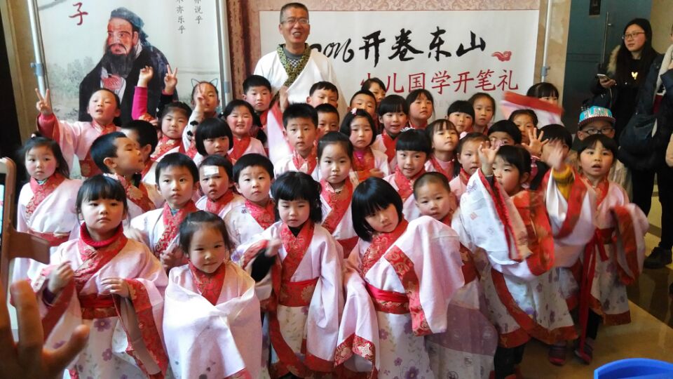 “開筆禮”是中國古代對少兒開始識字習禮形式的稱謂,俗稱“破蒙”,被稱為人生四大禮之一?;顒赢斕?,50名小朋友身著漢服,共同拜祭儒家學派的創(chuàng)始人――孔子。隨后在國學老師的帶領(lǐng)下,進行正衣冠、拜先師、朱砂啟智、寫“人”字等儀式。最后大家一同拜謝老師,合影留念。